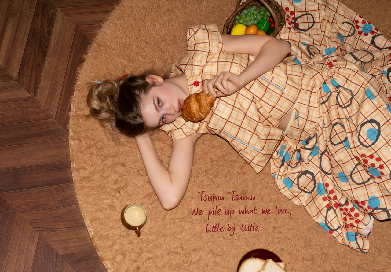 We pile up what we love, little by little. Not just piling into a collection—each piece adds to shaping who we are, and before we know it, these small piles are turning into tiny courage. Repeating graphics, layering trimmings on top, and mixing in different materials—turning each act of piling and layering into an act of play. Piling, layering, building… discovering little joys and emotions along the way. "Tsumu Tsumu" embodies how these layers turn into little sparks of personality and courage. Original bold prints, woven labels, trimmings, and three-dimensional padded ornaments bring the idea of "piling up your treasures on what you wear" to life. Silhouettes float somewhere between children's and adult styles, allowing playfulness and an adventurous spirit to naturally pile up in the design.