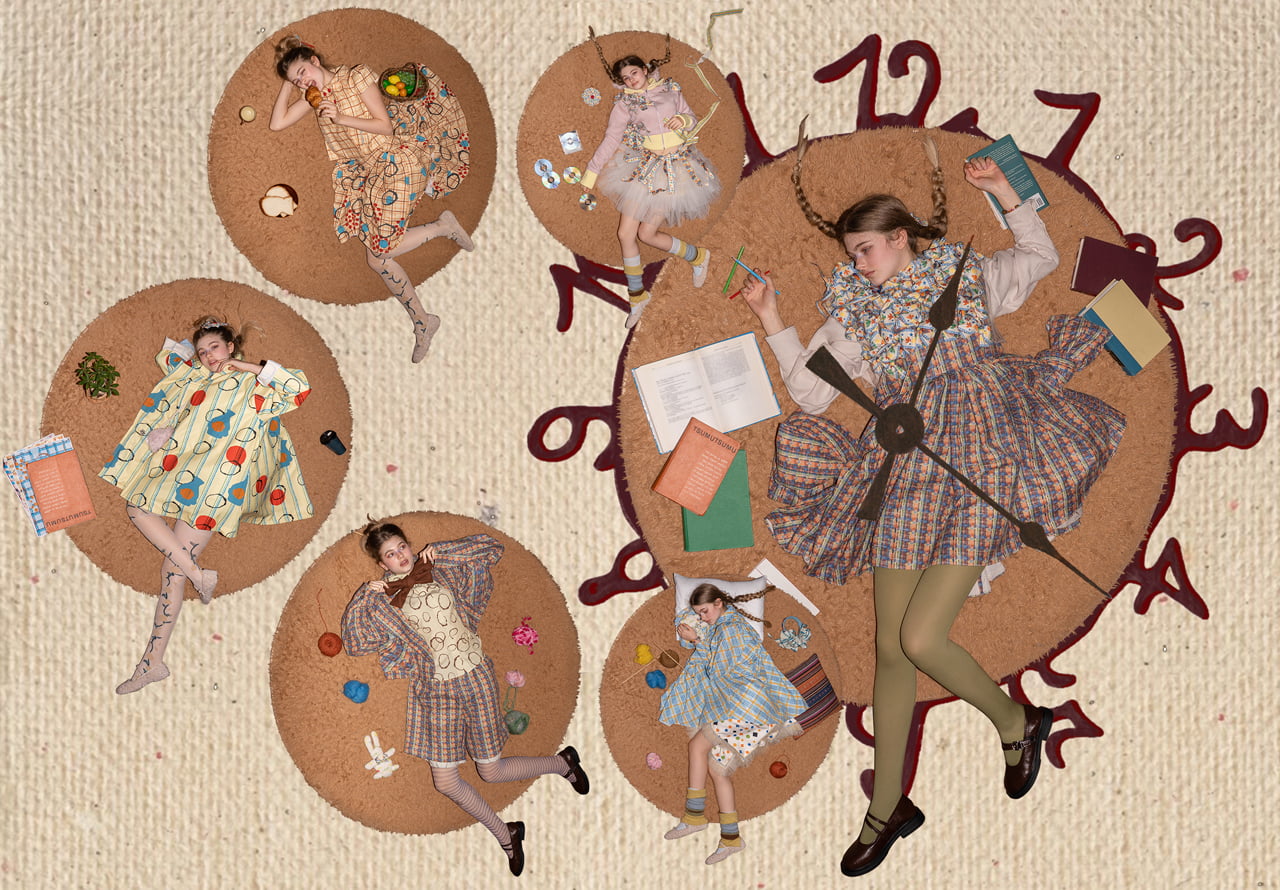 好きなものを少しずつ積み重ねていく。それはただ集めてコレクションするだけではなく、自分を形づくる過程であり、気づけばそれは勇気という力に変わっていく。 リピートしたグラフィックに、飾りを重ね、さらに異素材を組み合わせることで、自由に好きなものを積み上げていく感覚を「積む」という行為に置き換えて、日々の中にある小さな発見や感情を重ねていく楽しさを立体的に表現した。'ツムツム'とは、そんな重なり合いが個性や力に変わっていく過程を象徴している。 今回のコレクションは大胆な色使いのプリントを軸に、織りネームやテープ、綿入りの立体装飾などで、「大切なものが積み重なり合う」というアイデアを具体化した。子ども服と大人服のあいだのような曖昧なシルエットで構成し、遊び心と冒険心が自然に積み重なるデザインを目指した。