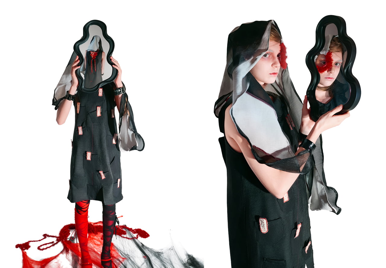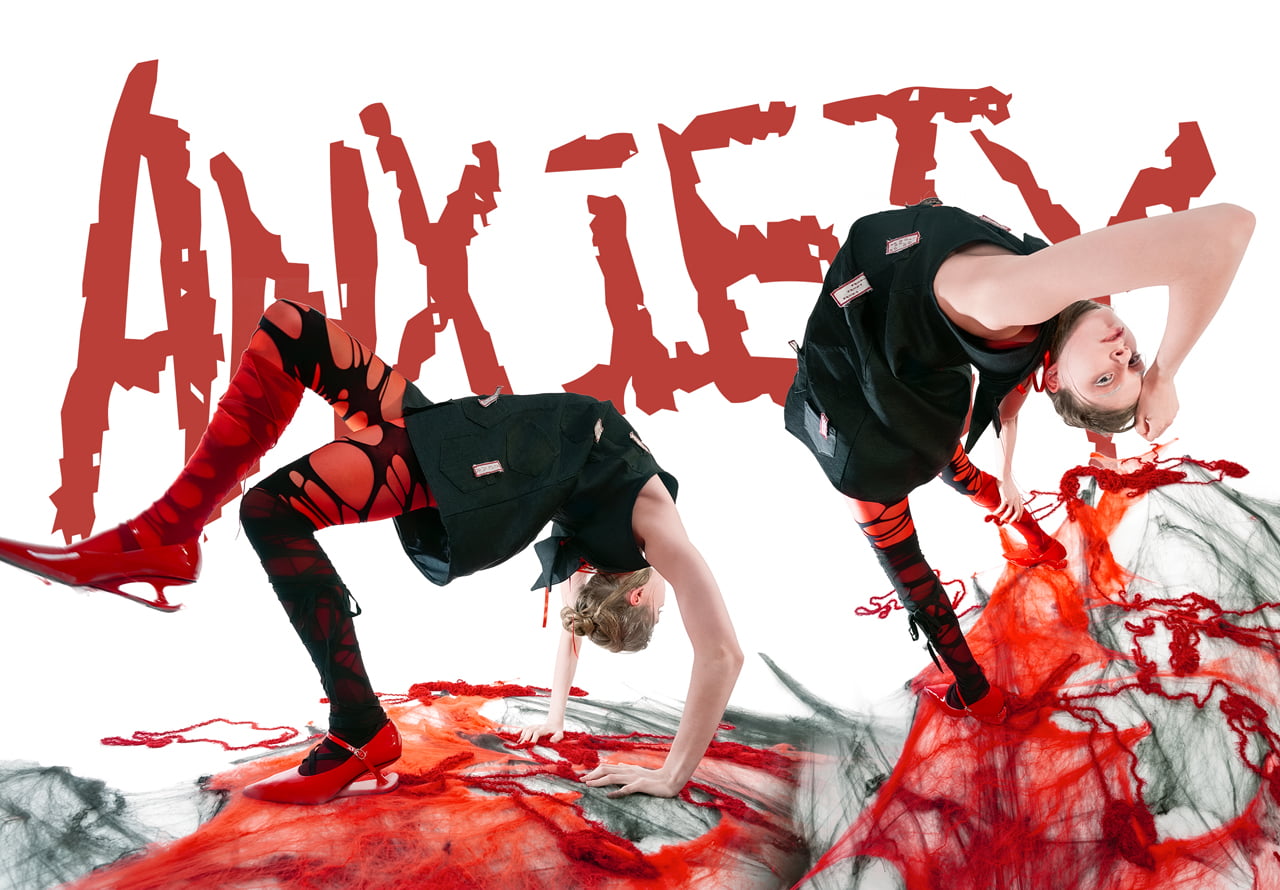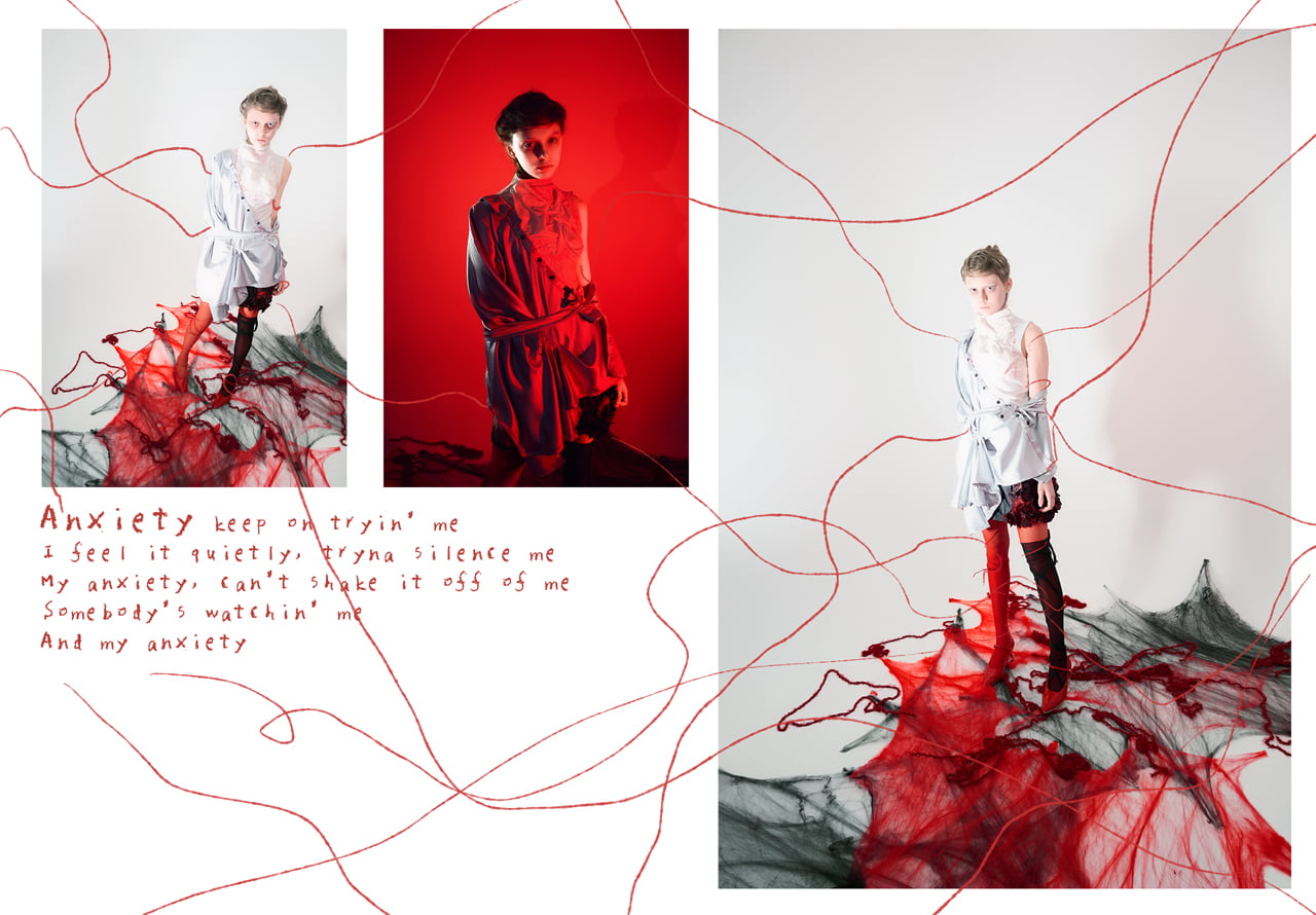 人が不安や焦りを感じるとき、身体の中心部、特に胴体に熱が集中すると言われています。その生理的な変化に着目し、感情が身体に現れる過程を服によって可視化を試みた。 本シリーズでは、焦燥が「兆し → 侵蝕 → 対峙 → 崩壊 → 共生」へと段階的に発展していく様をコレクションの中で表現。 特に、「無自覚な身体反応」や「脳内の混乱(思考のスパイラル)」に注目し、シルエットや素材、構造により、その不穏な揺らぎや、視覚的・感覚的ノイズを形にした。 衣服は単なる装いではなく、内面の感情を映す装置です。としてとらえ、人の「焦り」がどのように始まり、どのように身体を包み、やがて乗り越えられるのかを感情の流れと身体反応を交差させながら、「焦り」という目に見えない心象風景をデザインとして可視化した。