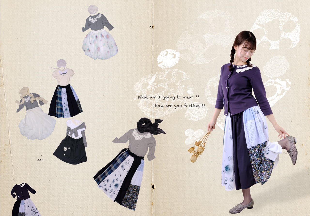 服は、感情を表現し、自分を守る存在。 きっかけは、重度のダウン症のはとこの保護者の一言。「おしゃれをするどころではない」そのことばから、服に対する感じ方や価値は人それぞれ違うのだと気づいた。 だからこそ、だれもが自分らしくおしゃれを楽しめる服のあり方を問いはじめた。 "白"は、まだ染まっていない純粋な心。 そこに、刺繍やハンドニットで感情の色を立体的に重ねていく。 「今日は、なに色を纏いたい?」という問いかけからはじまる、こころの天気に寄りそう一着。 着る人の心と連動する様子を、その日の気分に合わせて裏返すと、素材やデザインが変わるリバーシブルのスカートなど、感情に寄り添う仕掛けを服に込めました。 落書きした自由な色を身にまとえることで、「着たい」自然と思えるコレクションにしあげました。 感情の可視化と、誰かとの繋がりを紡ぐような服づくり。 その日の気分やささやかな変化を受けとめる服。 着ることで、自分自身を受け入れられる。 障がいのある人もない人も、感情の揺らぎとともにある服を届けたい。