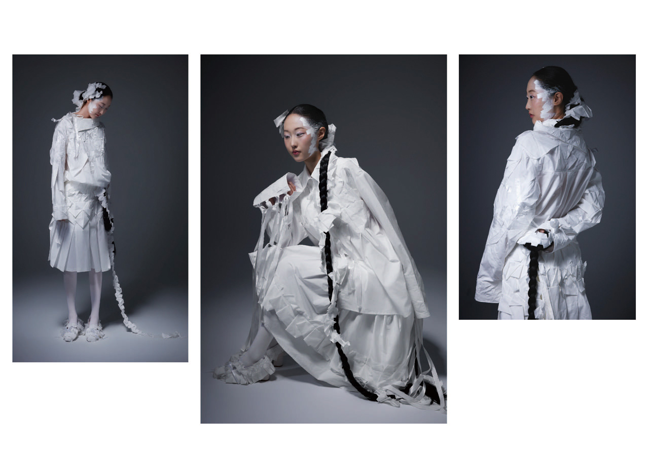このコレクションは、「思念」という静かな感情を軸に、 千羽鶴の祈りから生まれた。 届かぬ想い、言葉にならない祈り。 それらを折り紙の構造に託し、抑制と理性の狭間で形にしていく。 幾何学的に重なるラインは、心の奥に積もる"層"を映し出し、 モノトーンの世界が、感情の繊細な揺らぎを浮かび上がらせる。 テキスタイルは、柔らかさと張りを併せ持つ素材を重ね、 脆さと強さ、静けさと意志が共に息づく質感へ。 そして、人体の曲線に沿って再構成された折りの構造が、 感情の流れをなぞるように、日常の中へと静かに溶け込む。