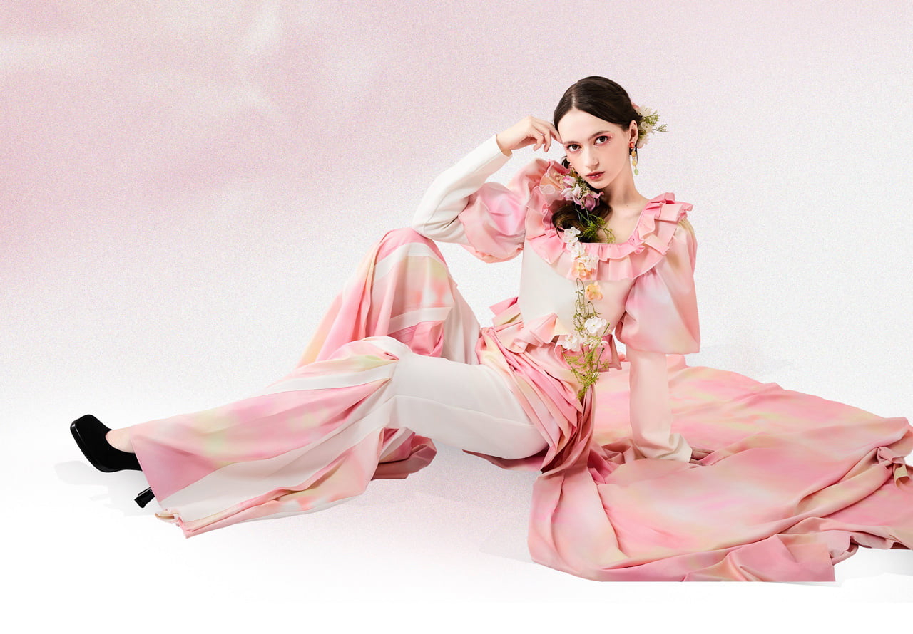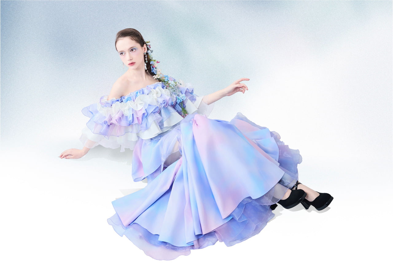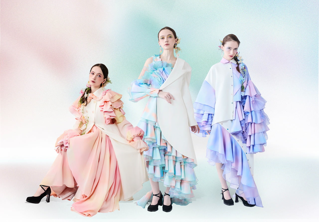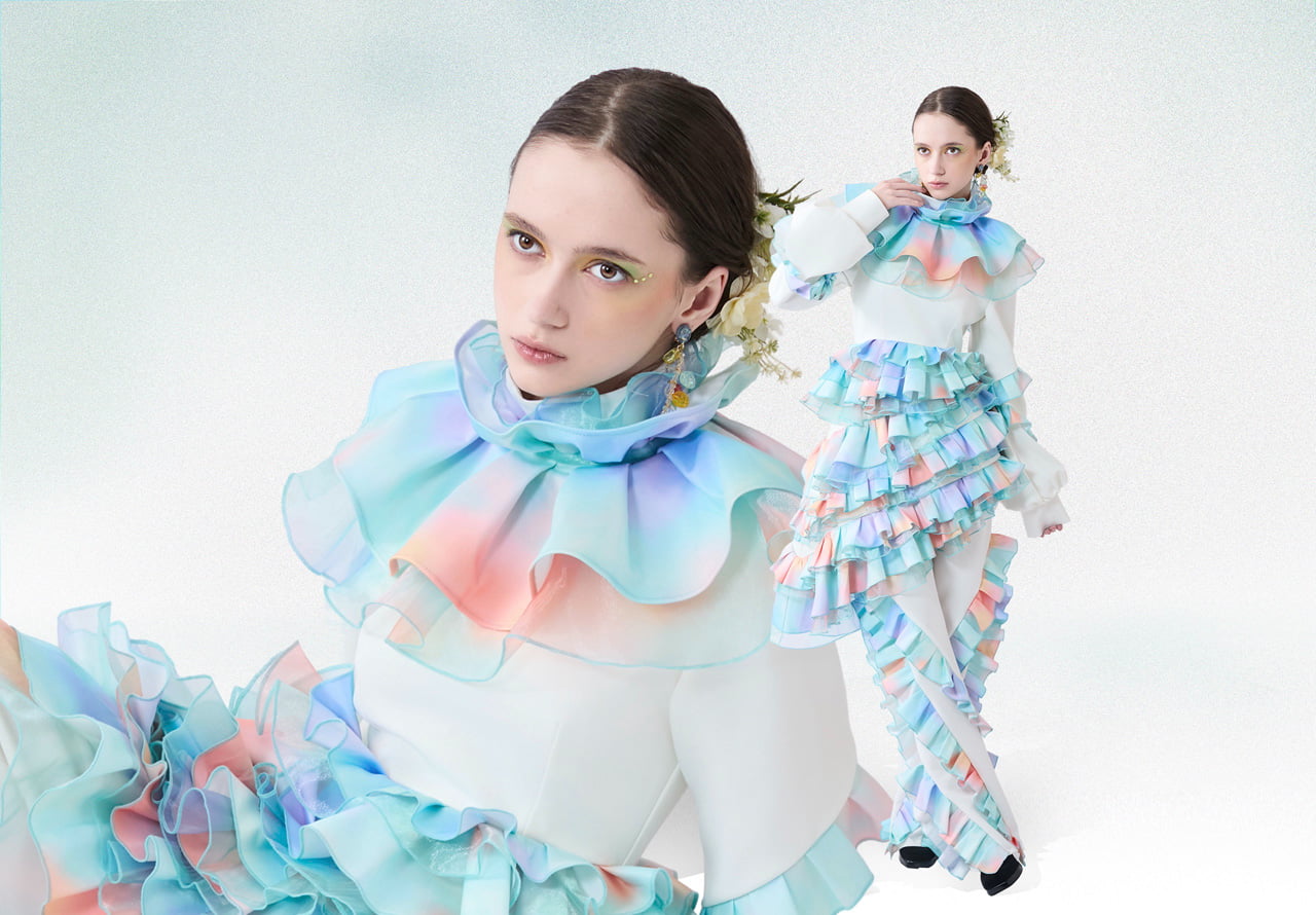 「すべての悩みは対人関係の悩みである」-アドラー心理学(アルフレッド・アドラー著『人間知識の心理学』より) アドラーの心理学を起点に「課題の分離」というテーマを設け、表現したものである。つまりこのコレクションは、「他者の課題に介入せず、自分の課題に他者を介入させない」ことで自他の境界を明確にし、精神的な消耗を減らすことを目指している。 白い部分は明確な精神空間を象徴し、プリント技法を使用し、彩色部分は感情の混乱を表現した。たとえばピンク、オレンジ、薄い黄色のグラデーションは、自分の課題に積極的に向き合う姿勢を表し、水色、濃いめの青、うすい紫は他者の課題と距離を取る冷静さを表現した。そして重なり合うフリルは感情の揺らぎを視覚化した。 コレクション全体を通じて、鑑賞者は不要なストレスから解放されることを願う。