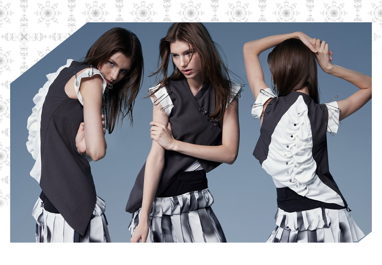「E-Crusaders」は、現代のネット社会における匿名攻撃や盲目的な集団行動への批判を目的とし、人々が互いを異質化し合う現象を通じて個人の考えを深めるとともに、盲従や集団的熱狂の危険性を警告する。 デザインには、カフカの『変身』から着想を得た昆虫モチーフを異質化の比喩として使用。中世十字軍時代のシルエットを現代的なカッティングで再構築し、麻や綿などの天然素材に加え、人工皮革やナイロンなどの化学素材、金属の副資材を組み合わせることで、現実とネット空間の繋がりを視覚的に表現した。 このシリーズを通じて、複雑化するネット環境の中で、個人が自律的かつ理性的に考えることの重要性を呼びかけたい。