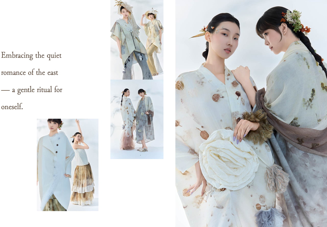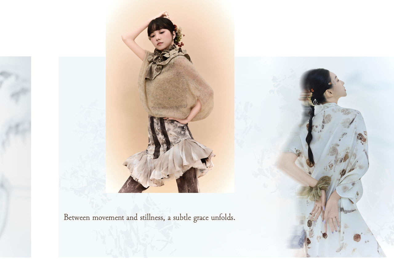 The essence of Eastern romance is found in the quiet beauty born from unspoken emotions and the depth of craftsmanship. I bring to life these silent layers of feeling that dwell in the heart, embodying them through the form of garments . For women who wish to love themselves and shape their own worlds with grace, the aesthetics of "yohaku" (negative space) and subtle rituals of daily life gently give form to emotions beyond words. Through traditional handcraft, I express inner richness as "okuyukashisa" (reserved grace), "shin no aru yawarakasa" (softness with inner strength), capturing the quiet presence of "yohaku"— portraying a modern woman who is calm, grounded, and quietly radiant. By grounding the palette in earthy tones to enhance the natural beauty of Eastern women, and combining tulle, lace, cotton-linen blends, and bio-based fabrics, I express an Eastern romanticism that unites sustainable fashion with inner depth. In this fast-changing world, handling emotions with care is akin to gently refining the shape of one's soul.I believe that feelings beyond words can still be expressed through what we wear.