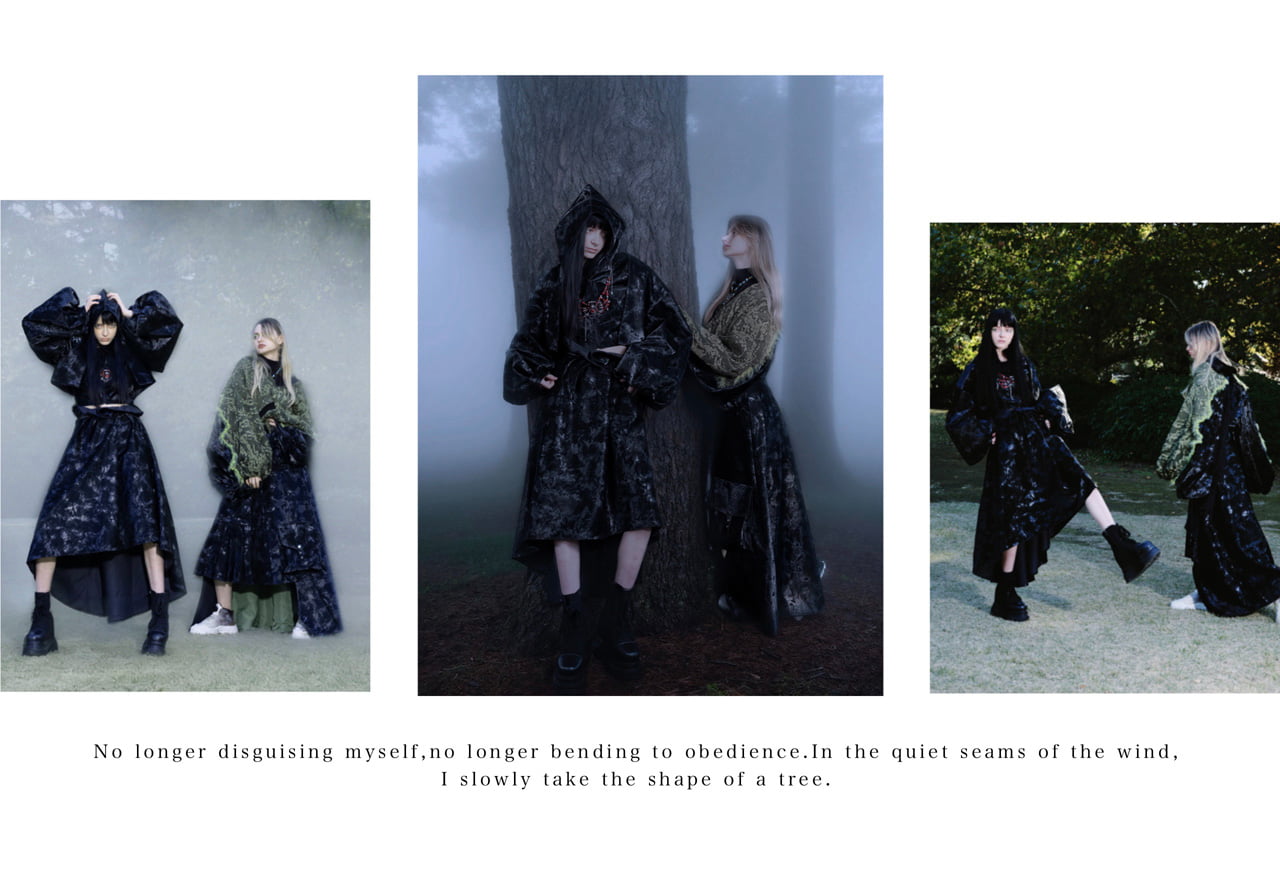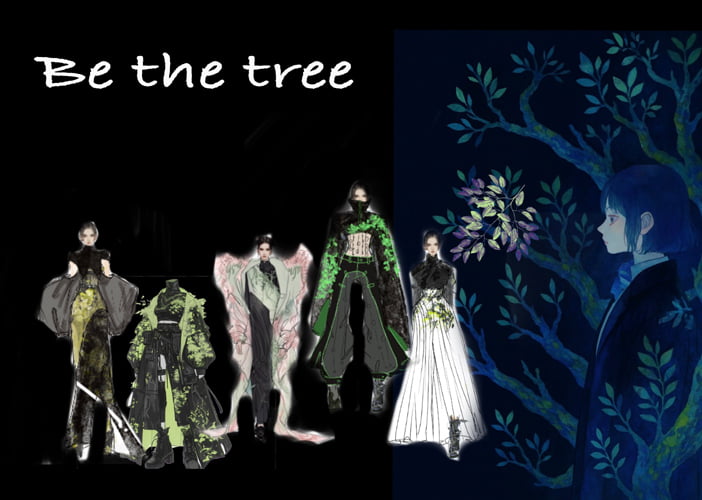 Under the theme of "Be the Tree," I explore the connection between the human inner self and the life force of nature. While people hide emotions to fit society, plants grow freely—unaffected and unapologetic. This attitude inspired a sense of individualism and quiet rebellion. I express a way of being that follows inner will rather than assigned roles. Voluminous patterns create space between body and garment, symbolizing an unpruned, freely growing form. Strong shoulders and sleeves convey vitality, while asymmetry represents resistance and breaking away from norms.