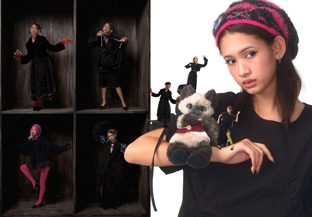 She is both human and doll. Through her eyes, she connects the outer world with inner emotion, expressing a longing for an ideal life. This collection offers escape from routine, with everyday-inspired silhouettes subtly transformed. Black forms the base, paired with seasonal prints to evoke nature. Each piece transforms into a bag to carry a doll. Seams mimic doll joints, symbolizing fragility and structure. It invites reflection through a bond with the doll, helping the wearer rediscover themselves between reality and dreams.