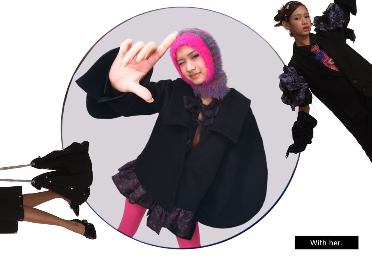 彼女は人である同時に、人形でもある。目を通じて、世界を感じ取りその世界と自分の内面との共鳴を表現する。その結果、人と人形の二重の視点を通じて、自分の内なる声や理想の生活への憧れを表す。 コンセプトの中心は、繰り返しの多い日常からの脱出にある。そのため、シルエットは日常着をベースにデザインしている。 黒を基調としながら、四季から着想を得たプリントを組み合わせることで、日常生活から離れ、自然を感じることを表現している。 また、人形と一緒に外出できるように、服がバッグに変形できる構造を表現している。 このコレクションを通じて、人形を通じた自己の対話と感情の投影を促し、日常と理想の狭間で自分自身を見つめ直すきっかけを届けたい。
