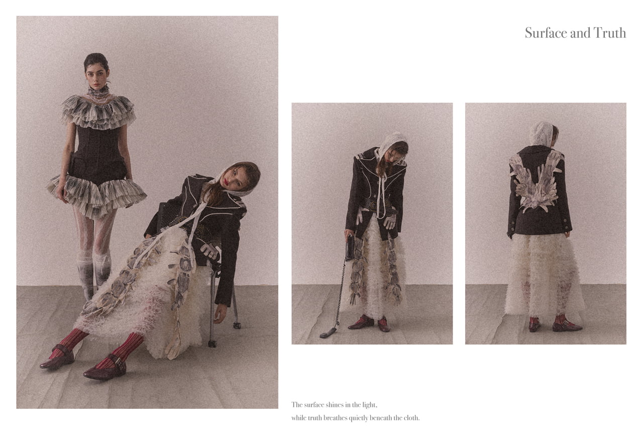 Clothing is treated as "evidence" from a crime scene. Its outward appearance may be complex or chaotic, but it conceals deeper truths within. This collection explores how garments act as social labels that assign identity, while also functioning as protective layers that shield the inner self.