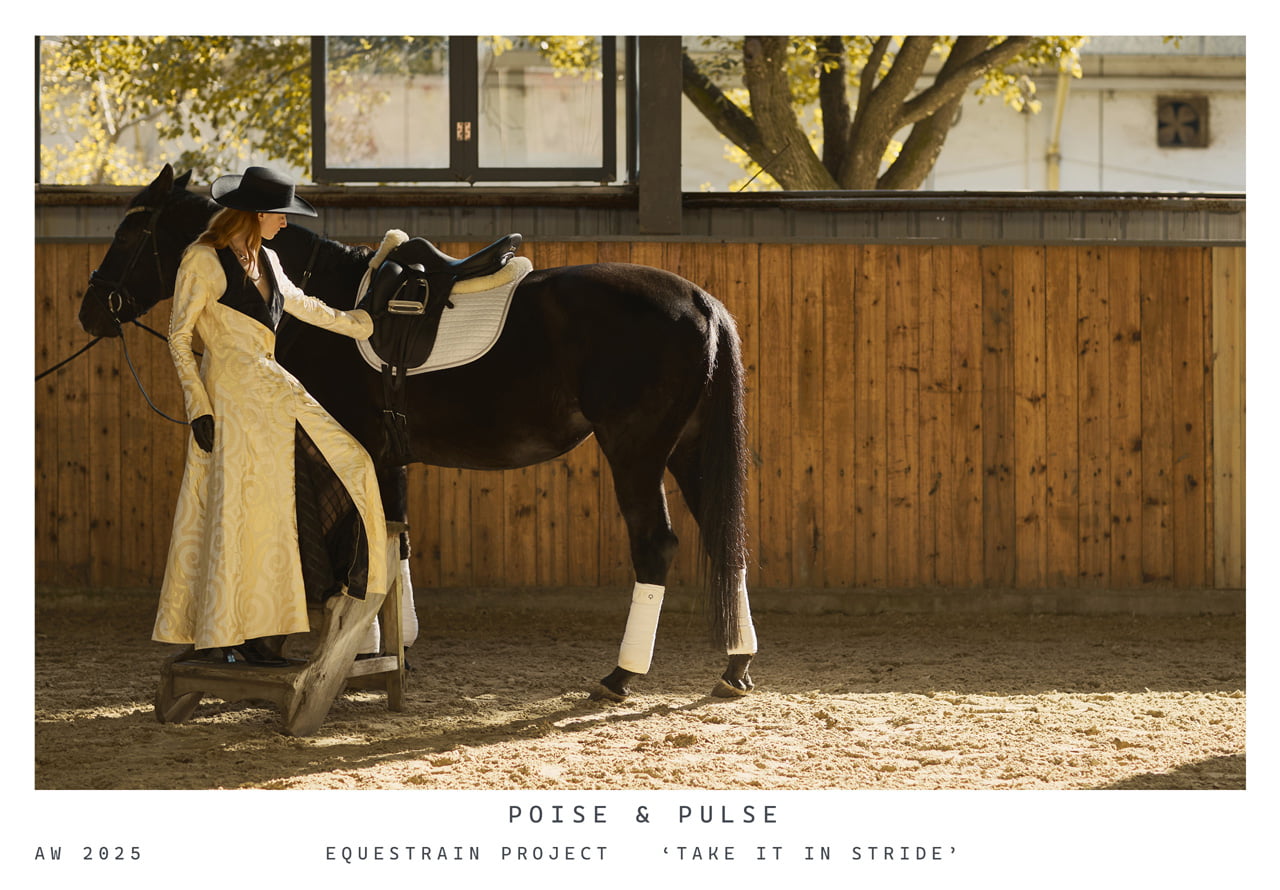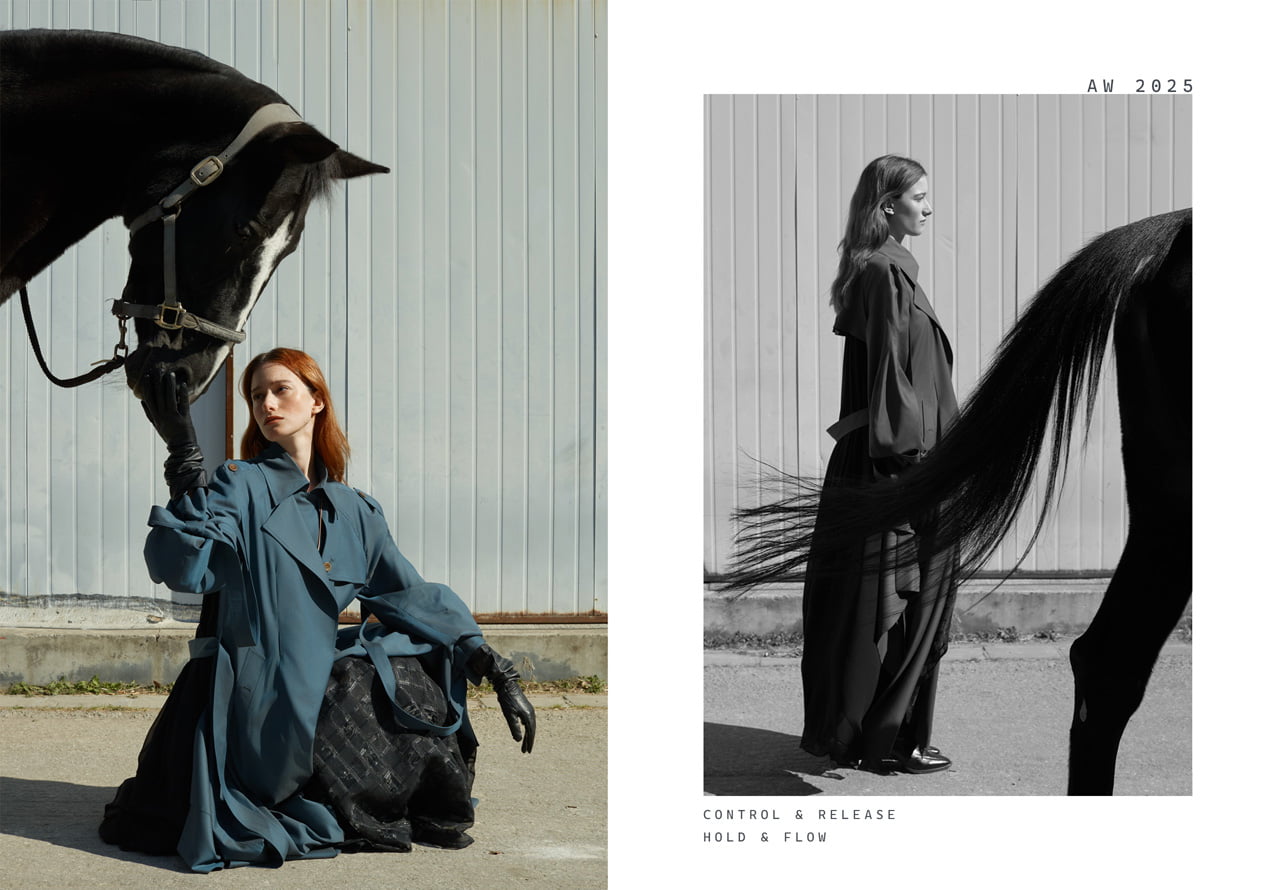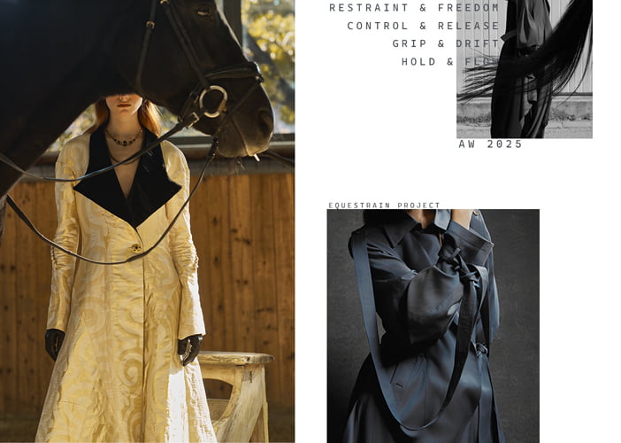 This collection is inspired by the flowing lines of dressage. Curved panel lines on the sleeves and collar express a sense of freedom, while multiple darts build three-dimensional surfaces, pursuing a natural and fluid beauty.