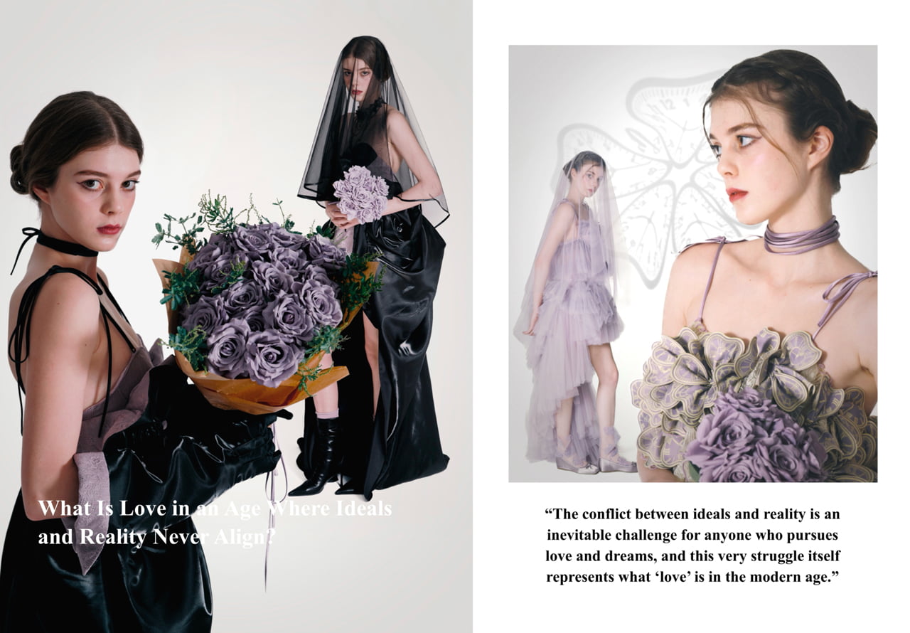 "La La Limbo" is a wedding dress collection that sways and flutters between ideals and reality, dreams and love. By twisting and layering soft fabrics into sculptural, flower-like forms, and combining them with original clock motifs and ribbons, the collection evokes the passage of time. It also reveals a gentle emotional turbulence through the harmony of its elements. Embracing "eternal love" while honoring the truth of the present moment, La La Limbo presents a new, poetic form of the wedding dress.