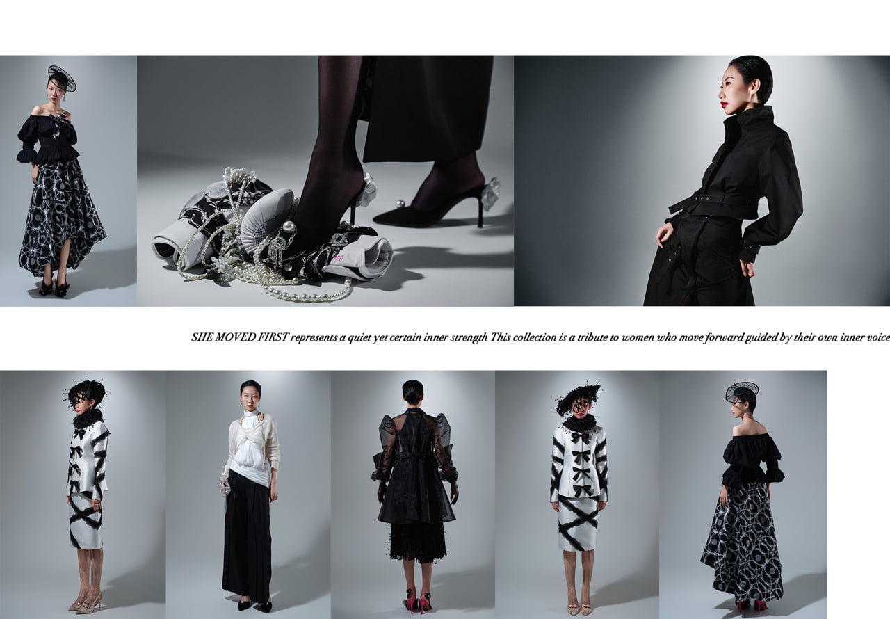 「SHE MOVED FIRST」は、他者の視線や社会的な期待に縛られることなく、自分の内なる感覚や直感に従って行動する女性の姿を描いたファッション提案である。 それは単なるスタイルの選択ではなく、内面から湧き上がる意志と、それに従って生きる自由を象徴している。 本コレクションは、映画『ドマーニ!愛のことづて』から着想を得ており、キーワードとなる 「反凝視(ANTI-GAZE)」 を通して、「見られる存在」ではなく、自ら物語を紡ぐ"能動的な主体"としての女性像を捉える。 コレクションでは、「見られる」という概念を視覚化するため、"目"を想起させるドット柄を分解・再構築し、新たな表現へと変換している。また、鉄線を用いた線的モチーフによって、視線によるプレッシャーや束縛感を造形的に示しながら、そこに抗う意志を浮かび上がらせる。 同時に、流行に依存しない長く付き合える服を目指し、時間に耐える価値を持ったデザインを追求している。 「SHE MOVED FIRST」——それは、静かでありながら確かな "意志の力" を象徴する。本コレクションは、自らの声に従って前へ進む女性たちへの、敬意とエールである。