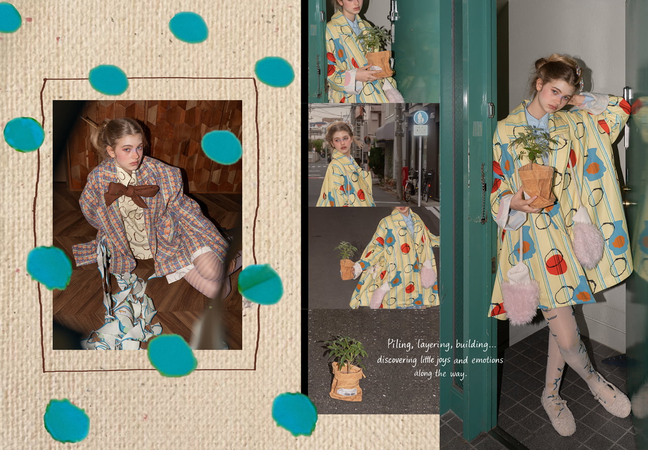 We pile up what we love, little by little. Not just piling into a collection—each piece adds to shaping who we are, and before we know it, these small piles are turning into tiny courage. Repeating graphics, layering trimmings on top, and mixing in different materials—turning each act of piling and layering into an act of play. Piling, layering, building… discovering little joys and emotions along the way. "Tsumu Tsumu" embodies how these layers turn into little sparks of personality and courage. Original bold prints, woven labels, trimmings, and three-dimensional padded ornaments bring the idea of "piling up your treasures on what you wear" to life. Silhouettes float somewhere between children's and adult styles, allowing playfulness and an adventurous spirit to naturally pile up in the design.