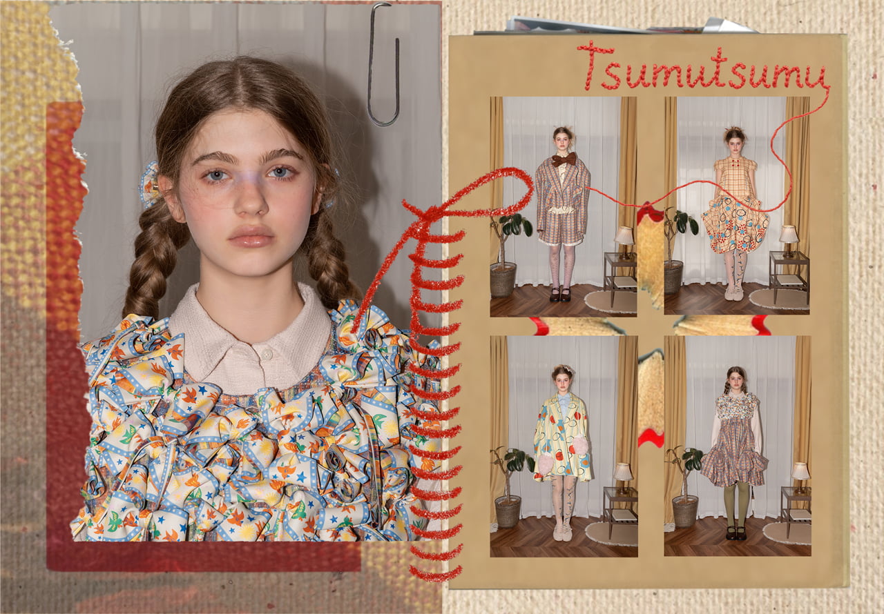 好きなものを少しずつ積み重ねていく。それはただ集めてコレクションするだけではなく、自分を形づくる過程であり、気づけばそれは勇気という力に変わっていく。 リピートしたグラフィックに、飾りを重ね、さらに異素材を組み合わせることで、自由に好きなものを積み上げていく感覚を「積む」という行為に置き換えて、日々の中にある小さな発見や感情を重ねていく楽しさを立体的に表現した。'ツムツム'とは、そんな重なり合いが個性や力に変わっていく過程を象徴している。 今回のコレクションは大胆な色使いのプリントを軸に、織りネームやテープ、綿入りの立体装飾などで、「大切なものが積み重なり合う」というアイデアを具体化した。子ども服と大人服のあいだのような曖昧なシルエットで構成し、遊び心と冒険心が自然に積み重なるデザインを目指した。