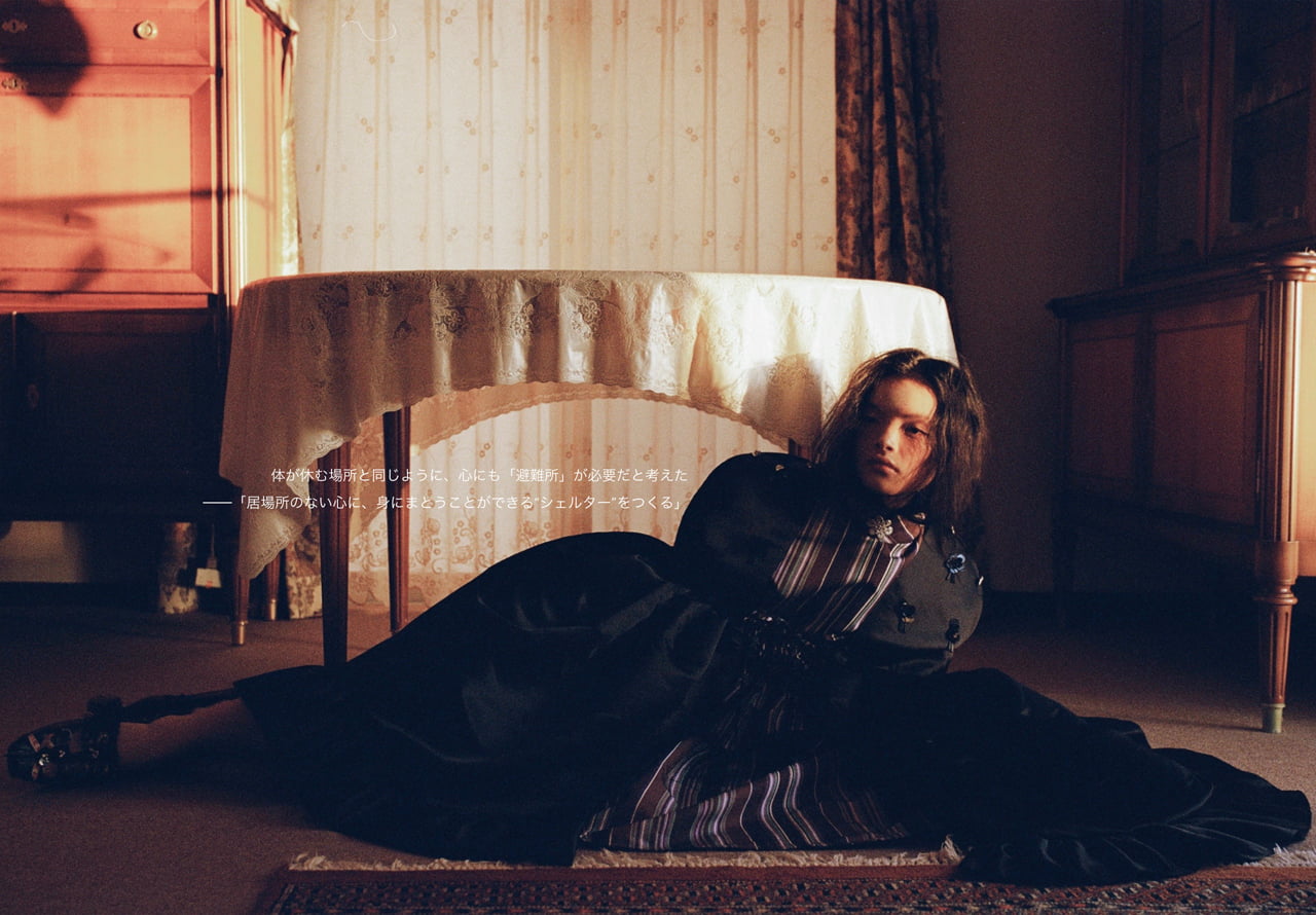 今の社会では、私たちには「家」はあっても、心が落ち着ける「居場所」がないと感じました。体が休む場所と同じように、心にも「避難所」が必要だという考えが、デザインテーマの出発点となりました。 「居場所のない心に、身にまとうことができる"シェルター"をつくる」 これが、今回のコレクションのコンセプトです。テキスタイルは、遊牧民の暮らしの風景や、自然の中で見つけた草花からインスピレーションを得て、安心感を包み込むようなイメージをオリジナル柄として制作しました。