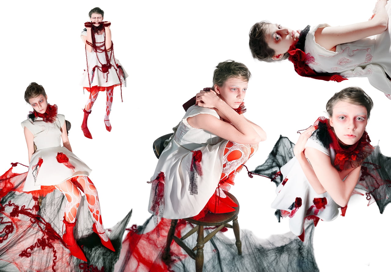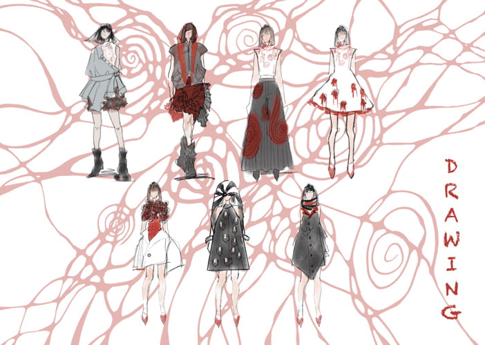 人が不安や焦りを感じるとき、身体の中心部、特に胴体に熱が集中すると言われています。その生理的な変化に着目し、感情が身体に現れる過程を服によって可視化を試みた。 本シリーズでは、焦燥が「兆し → 侵蝕 → 対峙 → 崩壊 → 共生」へと段階的に発展していく様をコレクションの中で表現。 特に、「無自覚な身体反応」や「脳内の混乱(思考のスパイラル)」に注目し、シルエットや素材、構造により、その不穏な揺らぎや、視覚的・感覚的ノイズを形にした。 衣服は単なる装いではなく、内面の感情を映す装置です。としてとらえ、人の「焦り」がどのように始まり、どのように身体を包み、やがて乗り越えられるのかを感情の流れと身体反応を交差させながら、「焦り」という目に見えない心象風景をデザインとして可視化した。