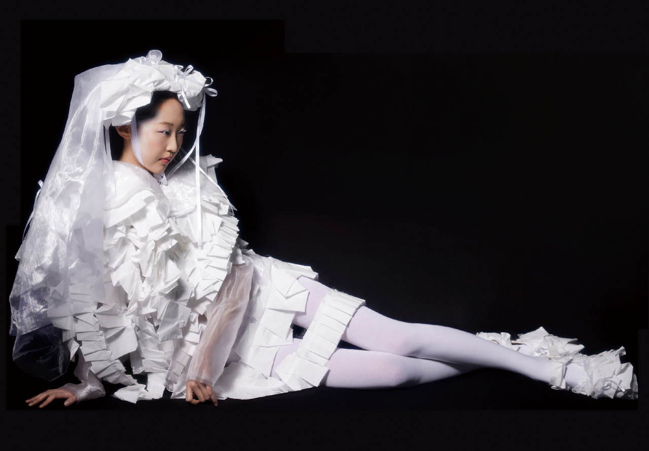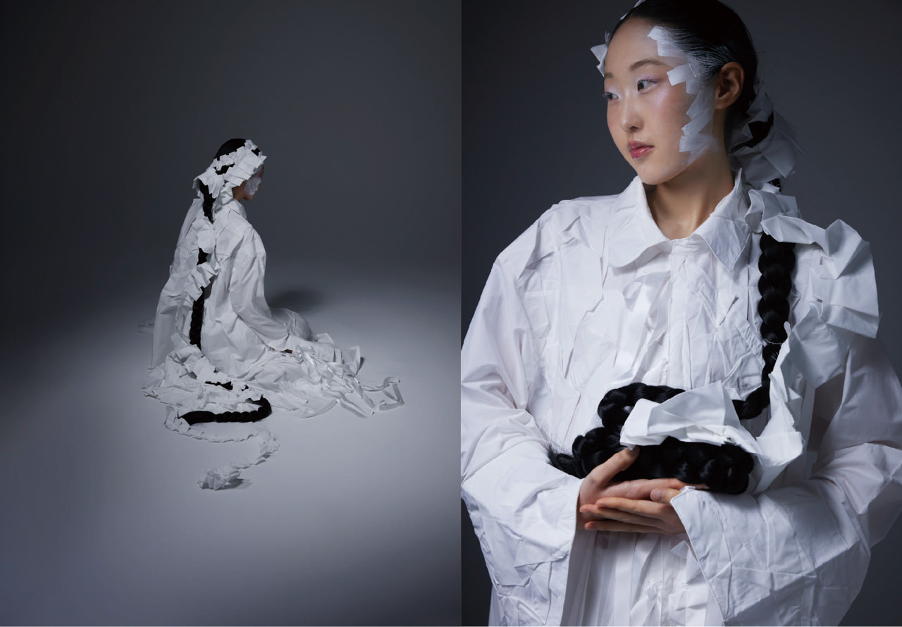 このコレクションは、「思念」という静かな感情を軸に、 千羽鶴の祈りから生まれた。 届かぬ想い、言葉にならない祈り。 それらを折り紙の構造に託し、抑制と理性の狭間で形にしていく。 幾何学的に重なるラインは、心の奥に積もる"層"を映し出し、 モノトーンの世界が、感情の繊細な揺らぎを浮かび上がらせる。 テキスタイルは、柔らかさと張りを併せ持つ素材を重ね、 脆さと強さ、静けさと意志が共に息づく質感へ。 そして、人体の曲線に沿って再構成された折りの構造が、 感情の流れをなぞるように、日常の中へと静かに溶け込む。