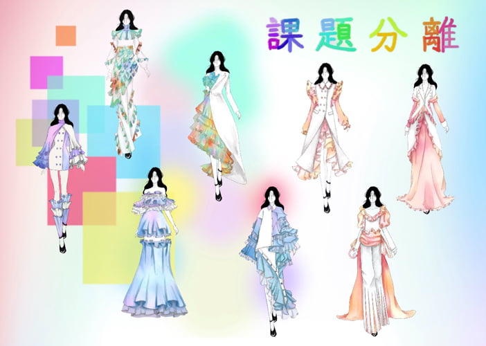 「すべての悩みは対人関係の悩みである」-アドラー心理学(アルフレッド・アドラー著『人間知識の心理学』より) アドラーの心理学を起点に「課題の分離」というテーマを設け、表現したものである。つまりこのコレクションは、「他者の課題に介入せず、自分の課題に他者を介入させない」ことで自他の境界を明確にし、精神的な消耗を減らすことを目指している。 白い部分は明確な精神空間を象徴し、プリント技法を使用し、彩色部分は感情の混乱を表現した。たとえばピンク、オレンジ、薄い黄色のグラデーションは、自分の課題に積極的に向き合う姿勢を表し、水色、濃いめの青、うすい紫は他者の課題と距離を取る冷静さを表現した。そして重なり合うフリルは感情の揺らぎを視覚化した。 コレクション全体を通じて、鑑賞者は不要なストレスから解放されることを願う。