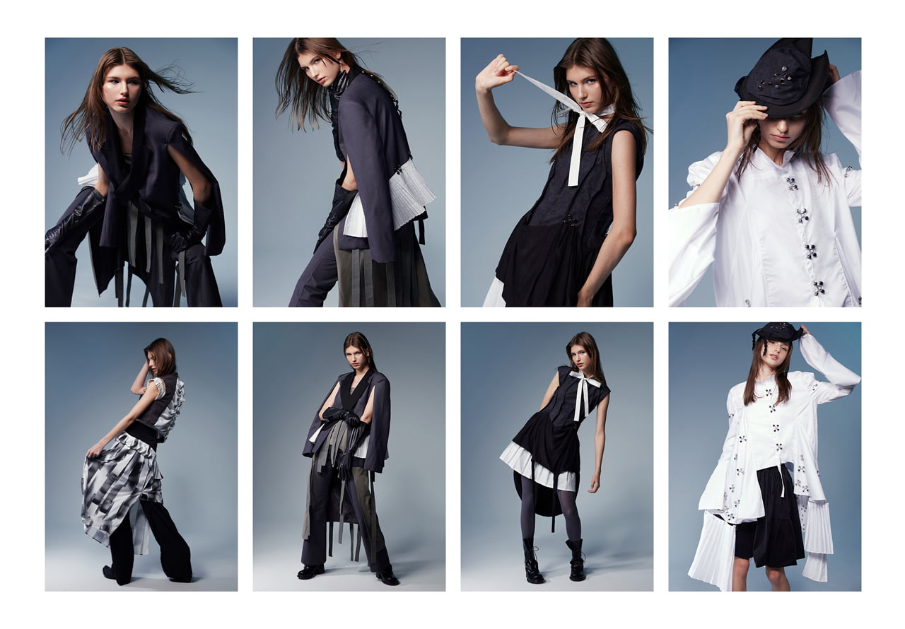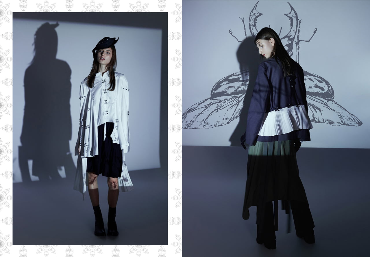 「E-Crusaders」は、現代のネット社会における匿名攻撃や盲目的な集団行動への批判を目的とし、人々が互いを異質化し合う現象を通じて個人の考えを深めるとともに、盲従や集団的熱狂の危険性を警告する。 デザインには、カフカの『変身』から着想を得た昆虫モチーフを異質化の比喩として使用。中世十字軍時代のシルエットを現代的なカッティングで再構築し、麻や綿などの天然素材に加え、人工皮革やナイロンなどの化学素材、金属の副資材を組み合わせることで、現実とネット空間の繋がりを視覚的に表現した。 このシリーズを通じて、複雑化するネット環境の中で、個人が自律的かつ理性的に考えることの重要性を呼びかけたい。