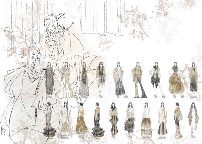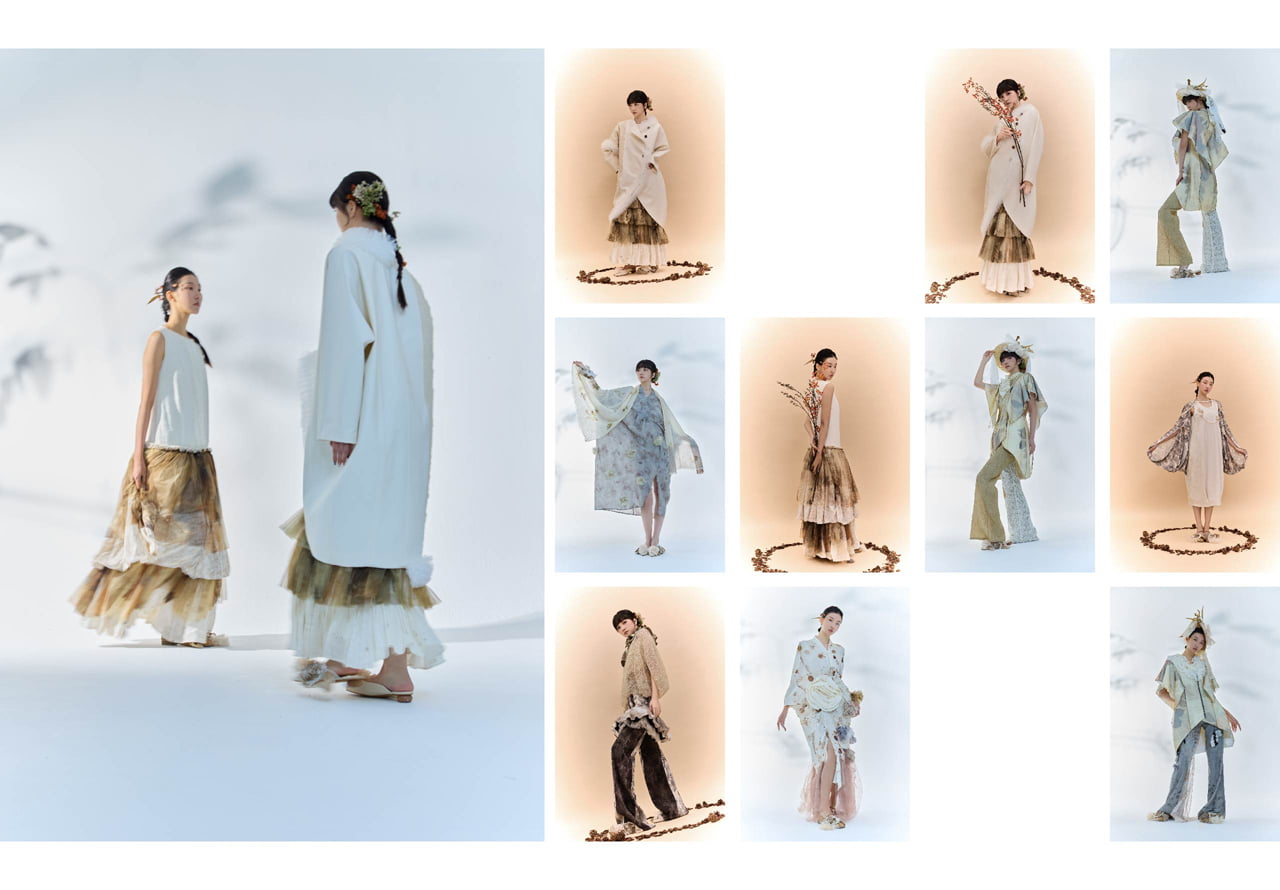 東洋のロマンとは、言葉にならない感情の層や、手仕事に宿る静かな美しさのことである。私は、人々の心の奥にあるその感情の佇まいを、服というかたちで具現化したいと考えている。 「自分を愛し、自分の世界を美しく整えたい」と願う女性たちにとって、「余白」の美意識やささやかな儀式感は、言葉にならなかった想いをそっと満たしてくれる。伝統的な手仕事の積み重ねを通じて、「奥ゆかしさ」や「芯のある柔らかさ」といった内なる豊かさを表現し、静かで芯のある現代女性像を描いている。 大地の色味を基調に、東洋の女性が持つ自然美を際立たせながら、チュールやレース、綿麻素材、生物由来のファブリックを組み合わせることで、持続可能なファッションと豊かな内面性を併せ持つ東洋的ロマンを表現している。 目まぐるしく移ろう時代のなかで、感情を丁寧に扱うことは心の輪郭を整える作業であり、言葉にならない思いが、纏うことで静かに伝わると信じている。