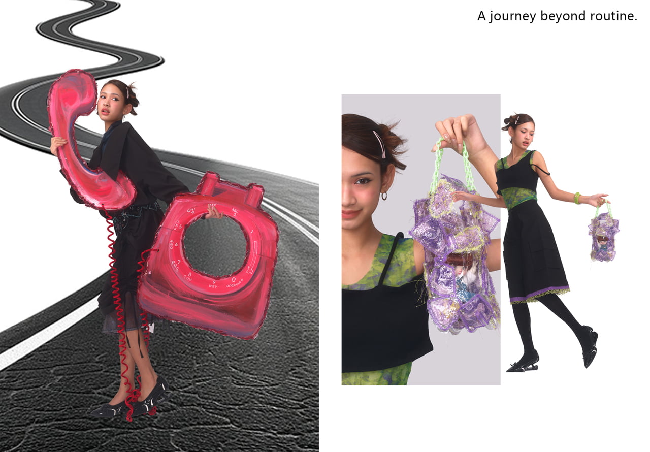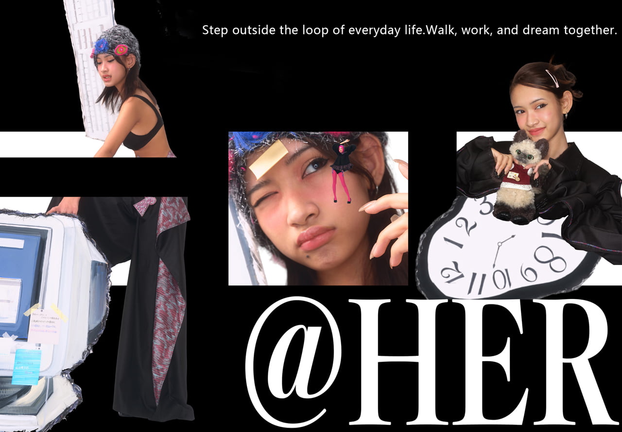 彼女は人である同時に、人形でもある。目を通じて、世界を感じ取りその世界と自分の内面との共鳴を表現する。その結果、人と人形の二重の視点を通じて、自分の内なる声や理想の生活への憧れを表す。 コンセプトの中心は、繰り返しの多い日常からの脱出にある。そのため、シルエットは日常着をベースにデザインしている。 黒を基調としながら、四季から着想を得たプリントを組み合わせることで、日常生活から離れ、自然を感じることを表現している。 また、人形と一緒に外出できるように、服がバッグに変形できる構造を表現している。 このコレクションを通じて、人形を通じた自己の対話と感情の投影を促し、日常と理想の狭間で自分自身を見つめ直すきっかけを届けたい。