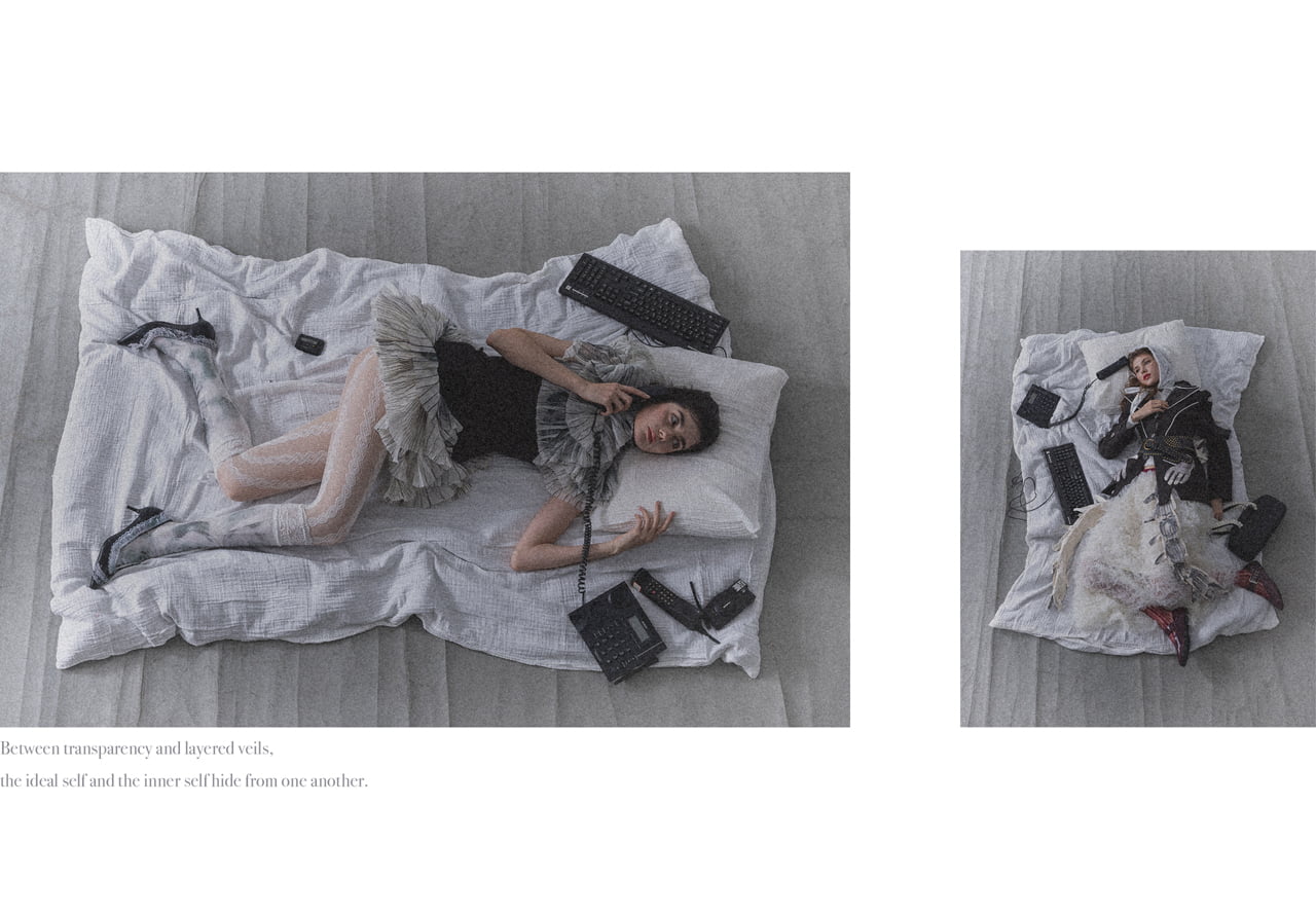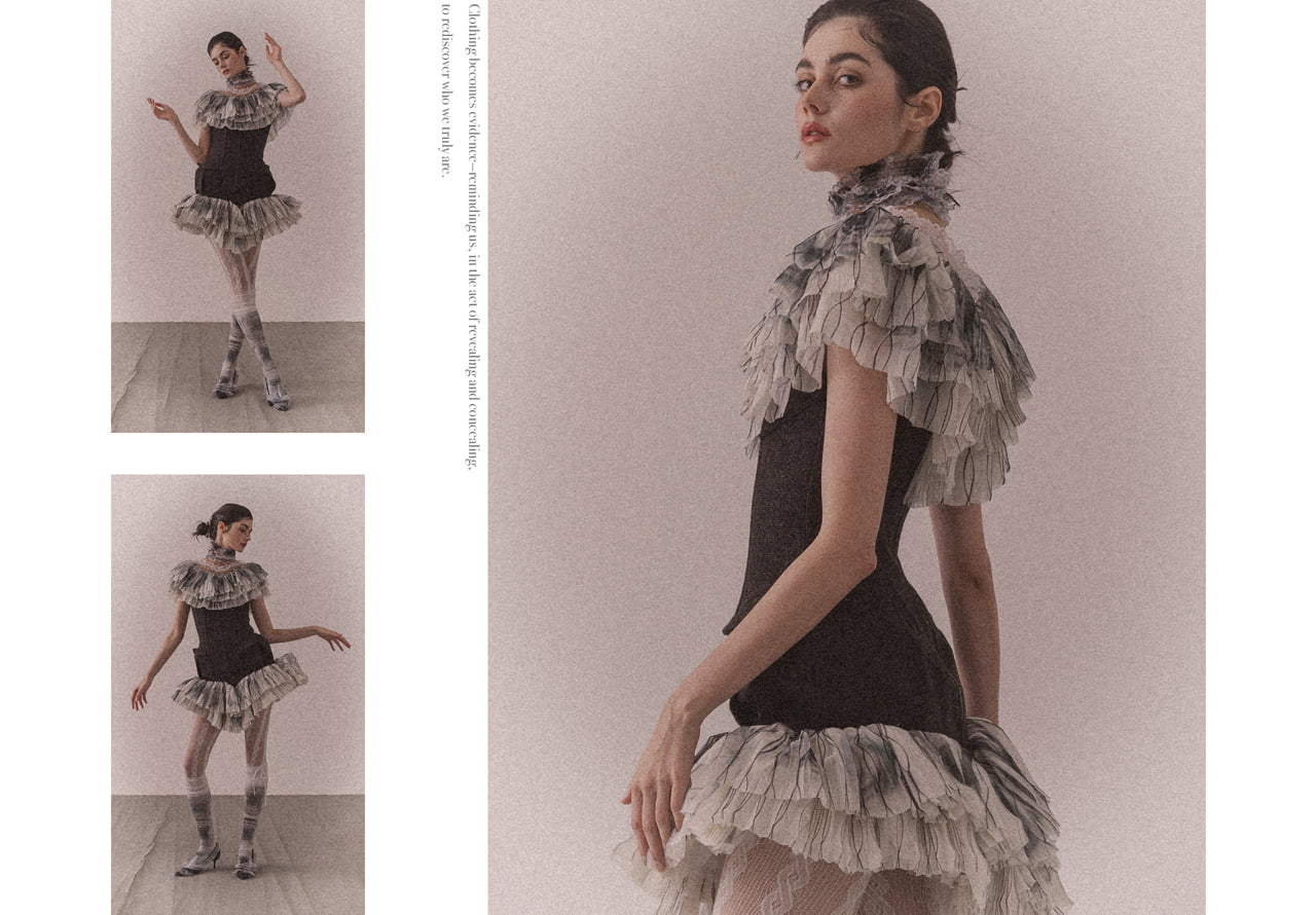 Clothing is treated as "evidence" from a crime scene. Its outward appearance may be complex or chaotic, but it conceals deeper truths within. This collection explores how garments act as social labels that assign identity, while also functioning as protective layers that shield the inner self.