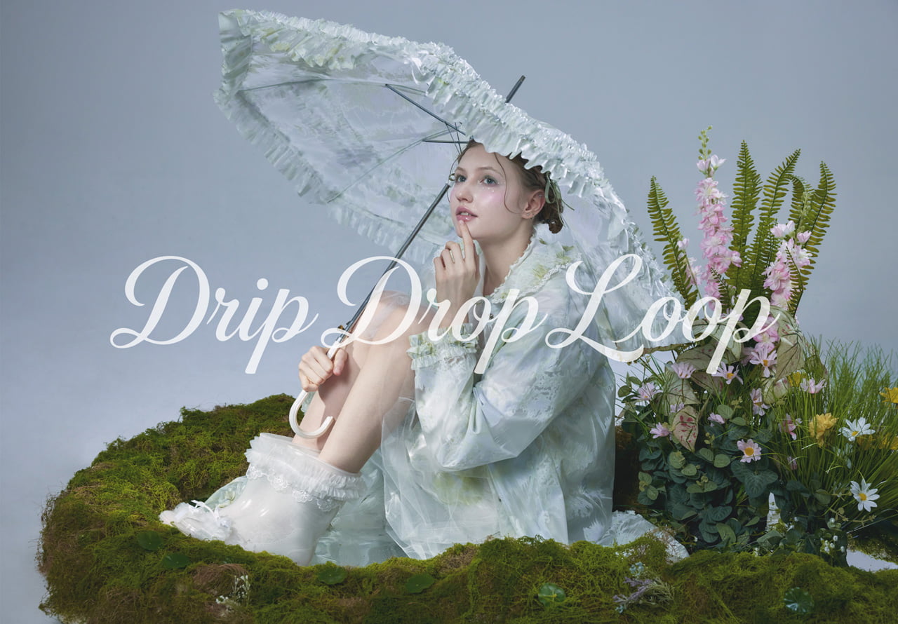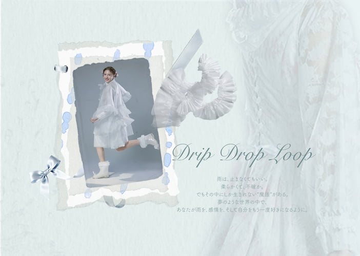 雨の日の感情や記憶をやさしく包みこむことをテーマにしています。多くの人は雨を不便や最悪と捉えますが、雨は自然の循環であり、命を育てる存在です。現代の私たちは、その美しさを忘れ、敵として避けてはいないでしょうか。私はそこに疑問を抱き、「雨の中でも心から自由でいられる服」をデザインしました。 雨が生み出す感情や、夢と現実の境界を視覚的に表現することを目指しています。雨粒の点・線・円や蓮のフォルム、透明・半透明の素材や色のグラデーションで、雨のやわらかさや高揚感、切なさを描き出します。 「雨=不快」というイメージを変えること。雨は避けるものではなく、飛び込みたくなるものへ。濡れてにじむ世界にこそ生まれる魔法を、衣服というメディアを通して届けたいと考えています。