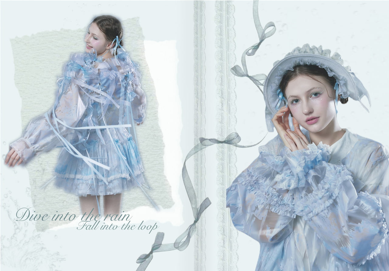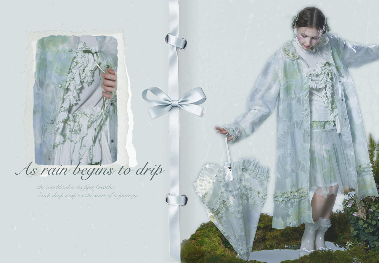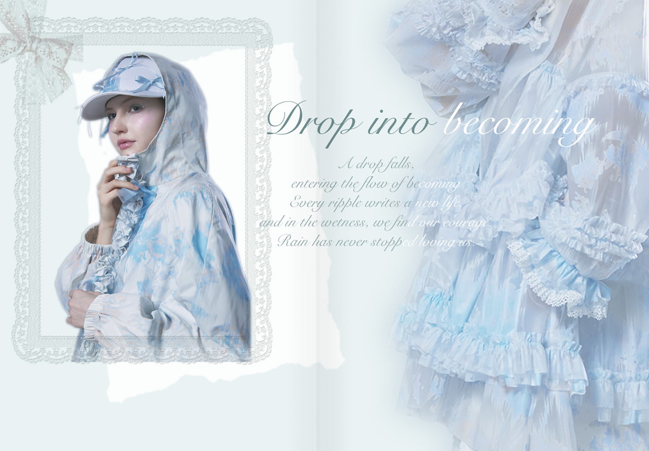 This project captures the quiet emotions and memories brought by rainy days. Although often seen as inconvenient, rain is a vital part of nature. I wondered why we often distance ourselves from it. Inspired by this, I designed clothing that allows the wearer to feel free in the rain. Using waterproof textiles, the collection blends function with charm, drawing from raindrop shapes and lotus forms. Sheer layers, gradients, ribbons, and lace express rain's softness, joy, and melancholy. Through fashion, I aim to shift how we see rainy days—inviting people to embrace their quiet beauty. I hope to reveal the quiet magic found in the soft, rain-blurred world