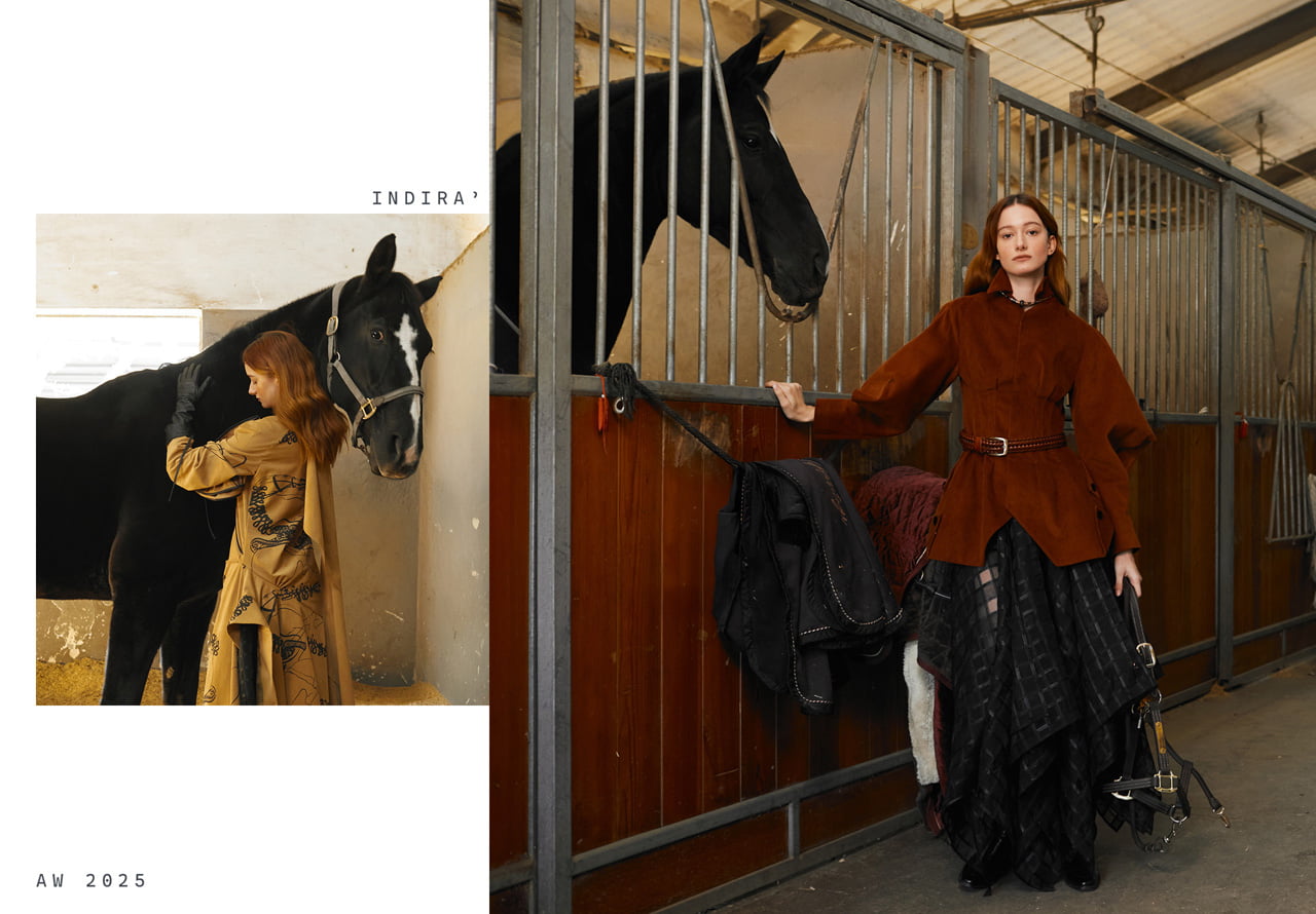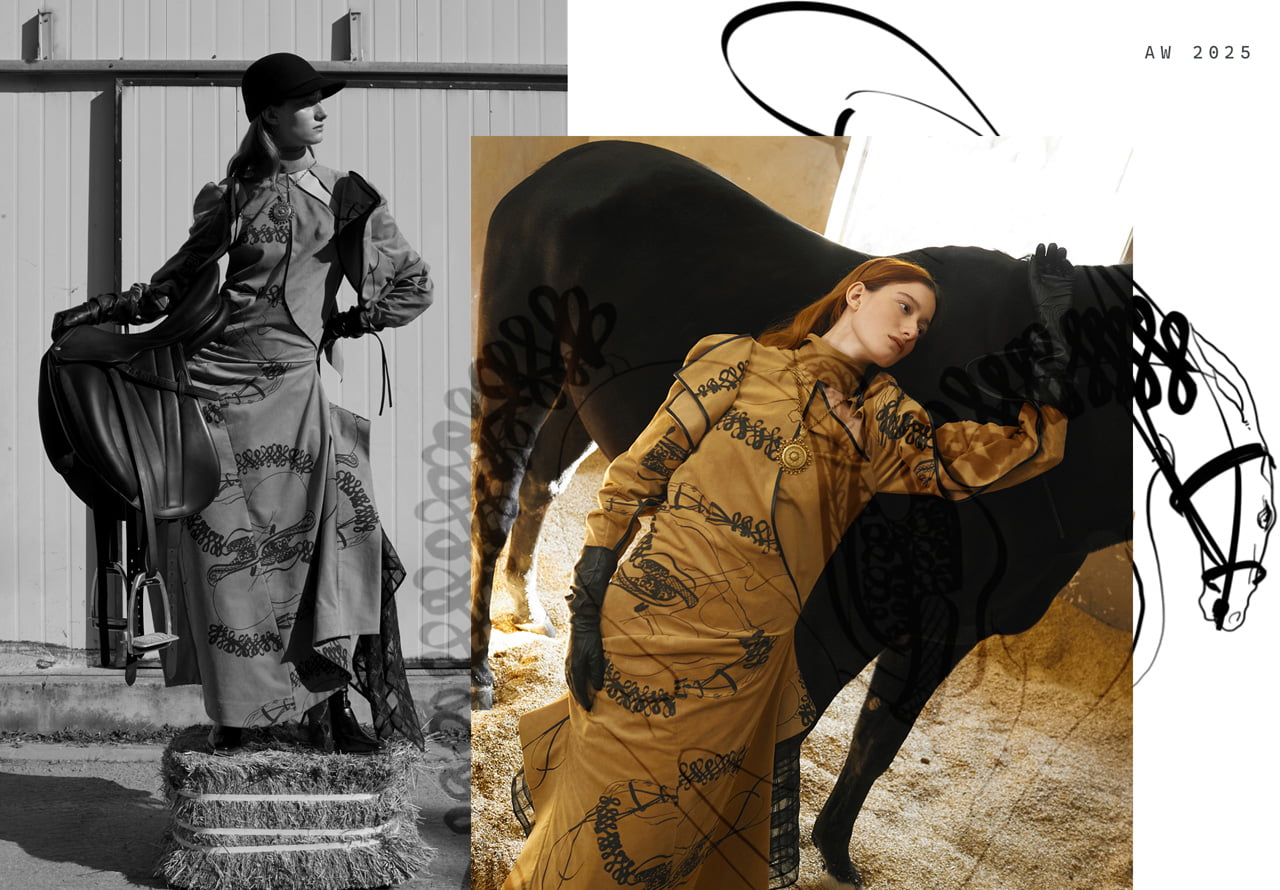 This collection is inspired by the flowing lines of dressage. Curved panel lines on the sleeves and collar express a sense of freedom, while multiple darts build three-dimensional surfaces, pursuing a natural and fluid beauty.