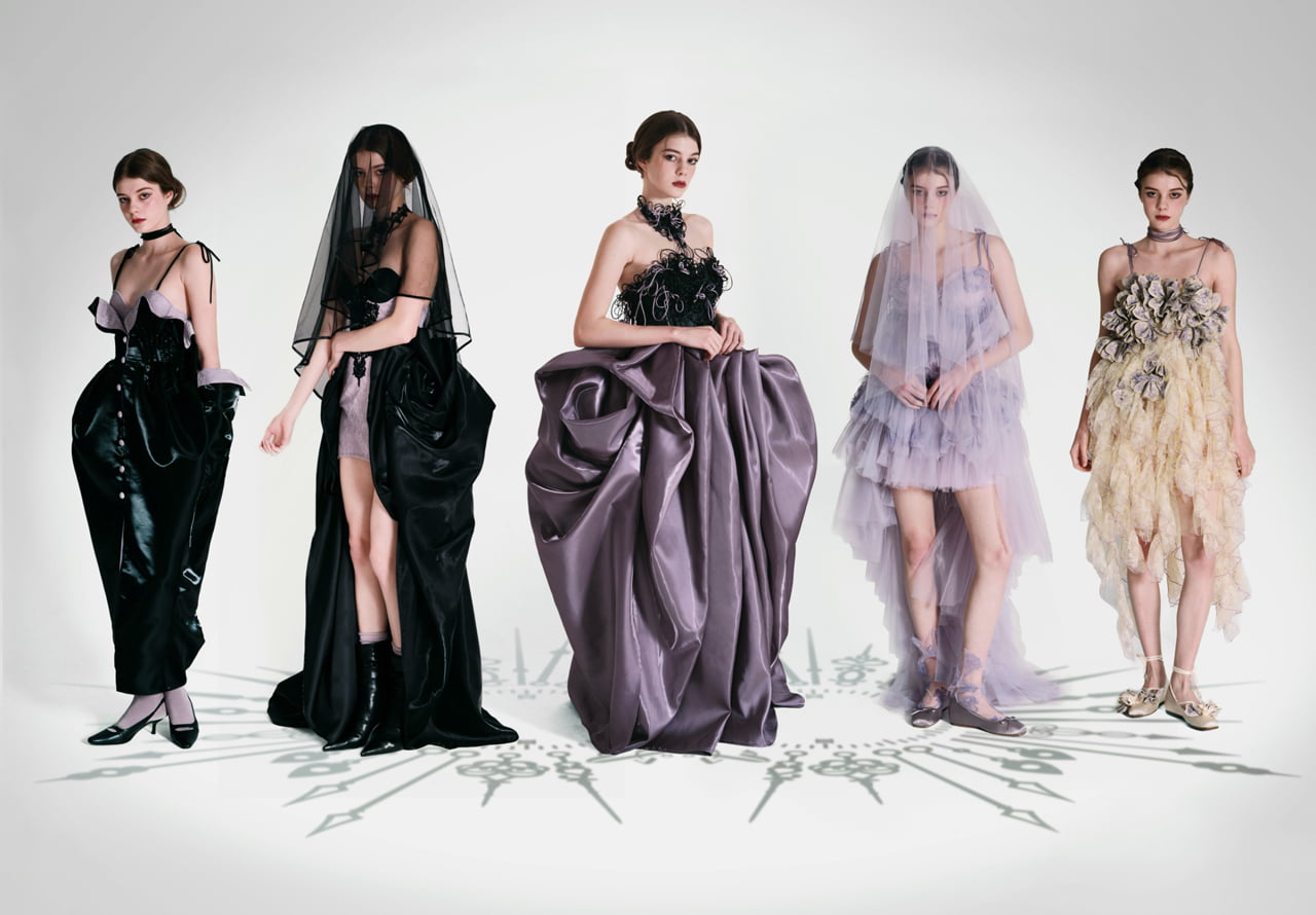"La La Limbo" is a wedding dress collection that sways and flutters between ideals and reality, dreams and love. By twisting and layering soft fabrics into sculptural, flower-like forms, and combining them with original clock motifs and ribbons, the collection evokes the passage of time. It also reveals a gentle emotional turbulence through the harmony of its elements. Embracing "eternal love" while honoring the truth of the present moment, La La Limbo presents a new, poetic form of the wedding dress.