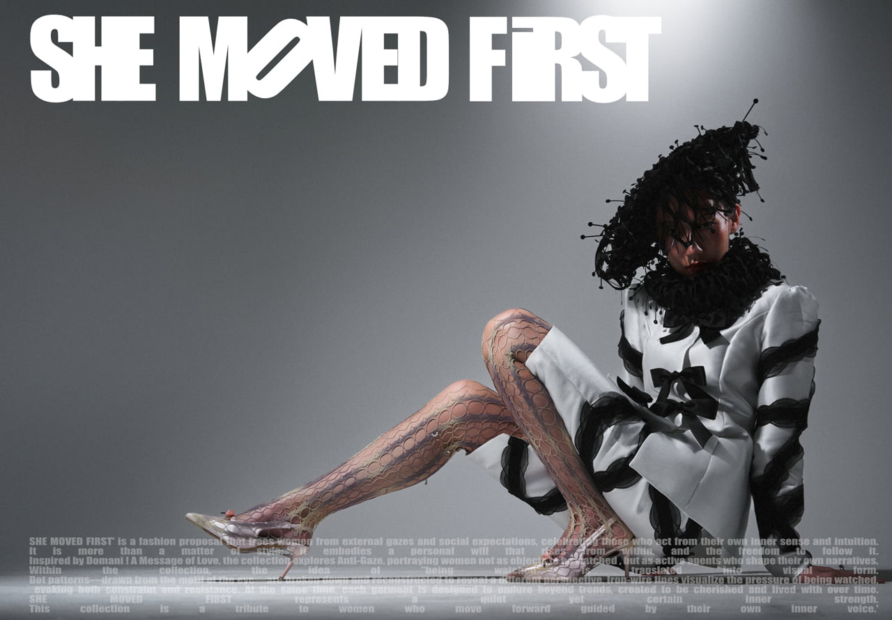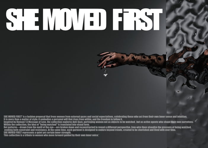 'SHE MOVED FIRST' is a fashion proposal that frees women from external gazes and social expectations, celebrating those who act from their own inner sense and intuition. It is more than a matter of style; it embodies a personal will that rises from within, and the freedom to follow it. Inspired by Domani! A Message of Love, the collection explores Anti-Gaze, portraying women not as objects to be watched , but as active agents who shape their own narratives. Within the collection, the idea of "being watched" is translated into visual form. Dot patterns—drawn from the motif of the eye—are broken down and reconstructed to reveal a different perspective. Iron-wire lines visualize the pressure of being watched, evoking both constraint and resistance. At the same time, each garment is designed to endure beyond trends, created to be cherished and lived with over time. SHE MOVED FIRST represents a quiet yet certain inner strength. This collection is a tribute to women who move forward guided by their own inner voice.