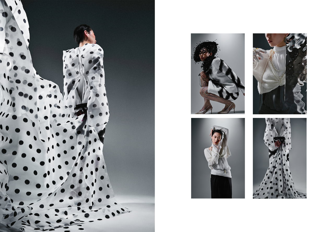 「SHE MOVED FIRST」は、他者の視線や社会的な期待に縛られることなく、自分の内なる感覚や直感に従って行動する女性の姿を描いたファッション提案である。 それは単なるスタイルの選択ではなく、内面から湧き上がる意志と、それに従って生きる自由を象徴している。 本コレクションは、映画『ドマーニ!愛のことづて』から着想を得ており、キーワードとなる 「反凝視(ANTI-GAZE)」 を通して、「見られる存在」ではなく、自ら物語を紡ぐ"能動的な主体"としての女性像を捉える。 コレクションでは、「見られる」という概念を視覚化するため、"目"を想起させるドット柄を分解・再構築し、新たな表現へと変換している。また、鉄線を用いた線的モチーフによって、視線によるプレッシャーや束縛感を造形的に示しながら、そこに抗う意志を浮かび上がらせる。 同時に、流行に依存しない長く付き合える服を目指し、時間に耐える価値を持ったデザインを追求している。 「SHE MOVED FIRST」——それは、静かでありながら確かな "意志の力" を象徴する。本コレクションは、自らの声に従って前へ進む女性たちへの、敬意とエールである。